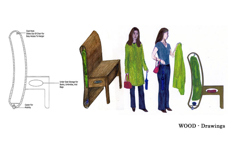 I created a chair with function, including a sliding hook inside the back of the chair for hanging and concealing a coat. The open back is made from laminated bent plywood attached to a plywood frame. The seat and legs are also plywood framed and use 26 gauge wire woven to create an open mesh. Liquid rubber was poured into a mold over the wire, which created the seat and back cushion. The shapes of the rubber cushions were determined by the placement of the human body on the chair. I handmade felt and attached it to the feet and bottom of the chair to allow for better sliding mobility. By conducting an in-depth investigation into furniture design, I experienced the design process from concept through construction and challenged all of my creative interests along the way.